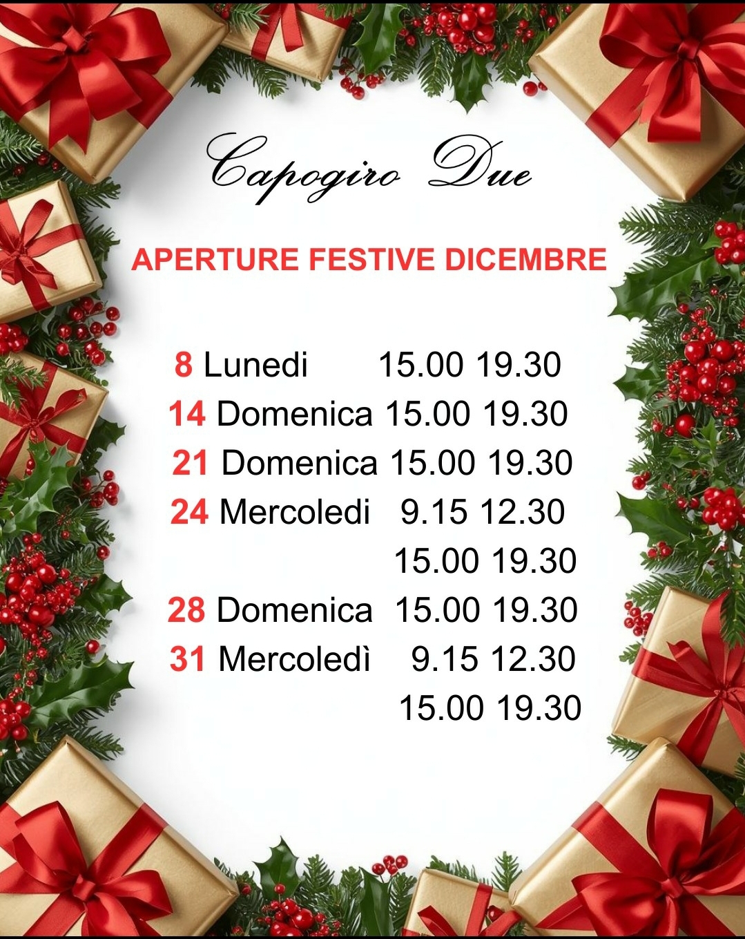 A Dicembre ti aspettiamo anche nei giorni festivi a partire da lunedi 8 per i tuoi regali di Santa Lucia e Natale.